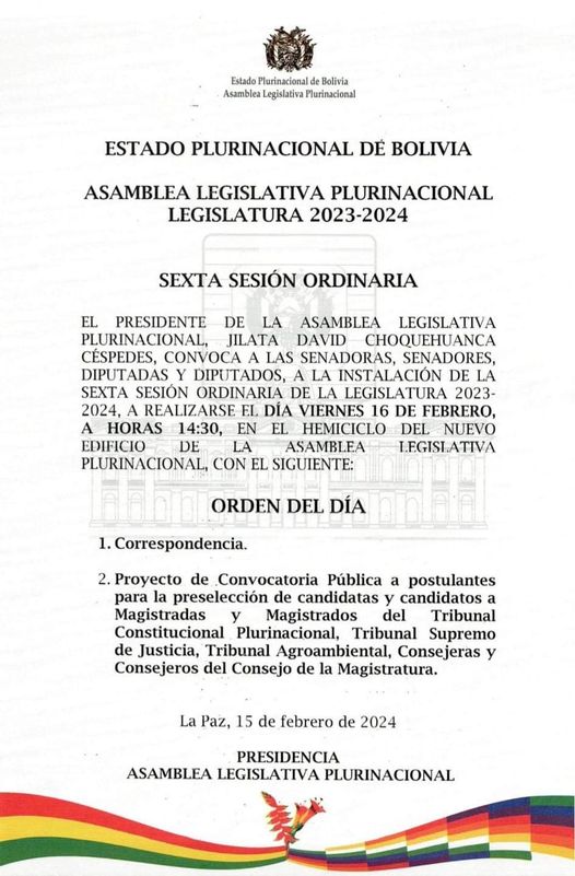 Vicepresidente convoca a sesión de asamblea este viernes a las 14:30 para debatir convocatoria a la preselección judicial
