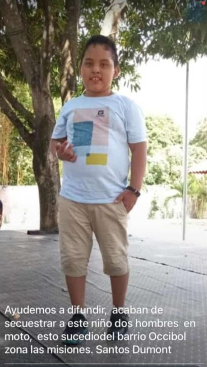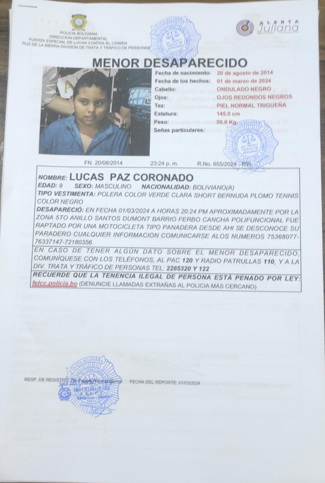 El menor de edad, de nombre Lucas Paz, fue raptado por dos personas que estaban a bordo de una motocicleta, por la zona del Barrio Las Misiones y quinto anillo. La Policía ya tiene conocimiento del hecho. El menor tiene 9 años, viste polera color verde, bermuda ploma y tenis color. Cualquier dato comunicarse con los telf. 76337147 o 72180356 o a los números de las autoridades policiales.
