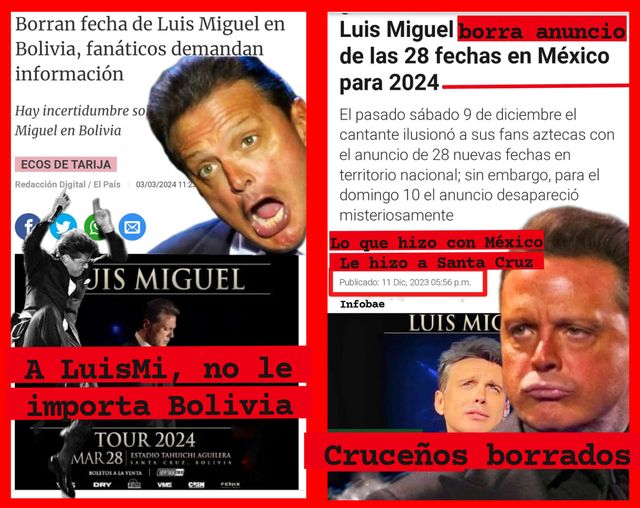 LUIS MIGUEL TUMBA A BOLIVIANOS Por la «borrada» de Bolivia, LuisMi 🎙️ debe devolver el dinero 🫰 que le adelantó el empresario boliviano para que él pueda hacer lo mismo con lo que compraron su ticket 🎫. Aquí el golpe 🥊 de LuisMi 🎙️ es contra todos, -empresario-intermediario-espectadores-; todos bolivianos. LuisMi 🎙️en diciembre 2023, ya habían hecho lo mismo con varias ciudades mexicanas ❌. En enero de 2024, se esperaba la presentación en el Estadio Olímpico de Santo Domingo, República Dominicana. Se reprogramó. Recien nomás, también canceló el concierto en Cali, Colombia el 15 de febrero. «A pesar de las múltiples cancelaciones en los diferentes países, todas las entradas vendidas 🪙 han sido reembolsadas de manera oportuna»
