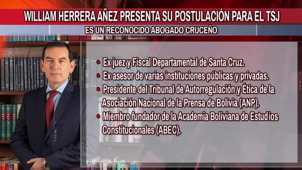 El reconocido abogado cruceño y exfiscal, William Herrera Añez, presentó su postulación ante la Comisión de Constitución en el marco del proceso de preselección de candidatos para el Tribunal Supremo de Justicia (TSJ) en las próximas Elecciones Judiciales de Bolivia.