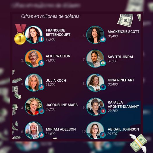 ELLAS SON En el primer puesto está Francoise Bettencourt Meyers con una fortuna 🪙 que ronda los 98,600 millones de dólares, según Forbes. 💰 Ella es la heredera de L’Oreal, el fabricante de cosméticos más grande del mundo.