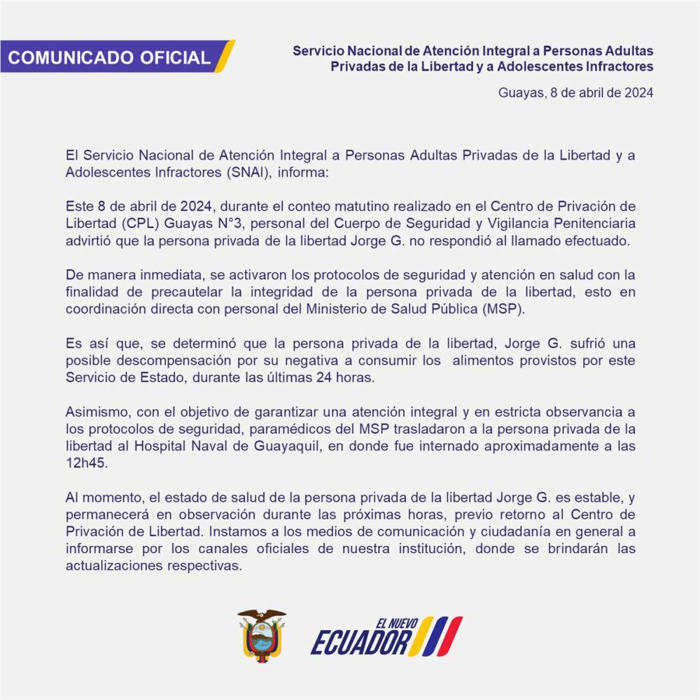 🇪🇨 | ÚLTIMA HORA: El SNAI informó en un comunicado que Jorge Glas, «sufrió una descompensación por su negativa a consumir los alimentos provistos por la entidad dentro del recinto penitenciario».