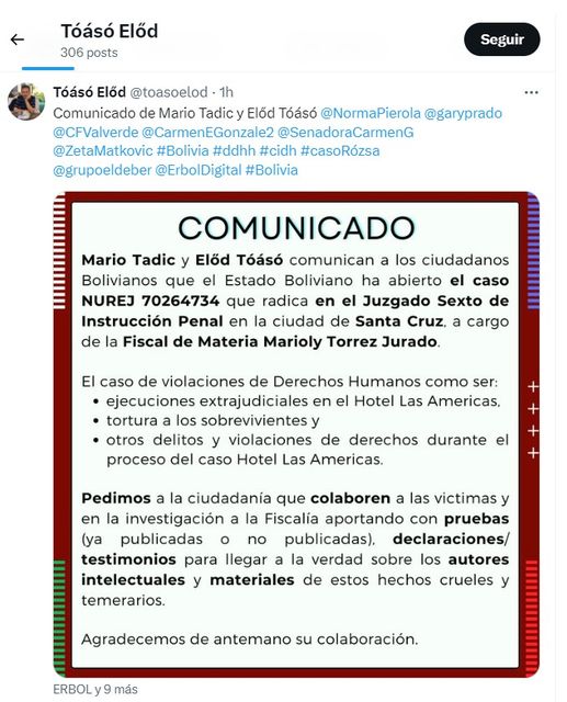 Los sobrevivientes Mario Tadic y Elod Toasó confirmaron la información a traves de las redes sociales y piden a la población aportar con pruebas o testimonios para que se haga justicia.