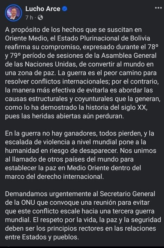 A través de sus redes sociales, el presidente Luis Arce Catacora sé refirió al ataque por parte de Irán contra Israel y manifestó que la posición de Bolivia es promover la búsqueda de una solución pacífica al conflicto.