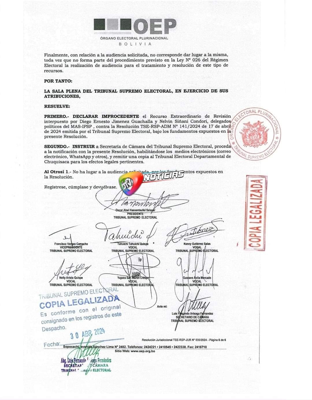 Sala Plena del Tribunal Supremo Electoral, informó que rechazó el recurso extraordinario de la dirección nacional del Movimiento al Socialismo, que pretendia habilitar la supervisión del congreso de ese partido en Villa Tunari. El órgano rechazo esa solicitud y se mantiene en negarles el acompañamiento y tampoco los recibirán en audiencia.