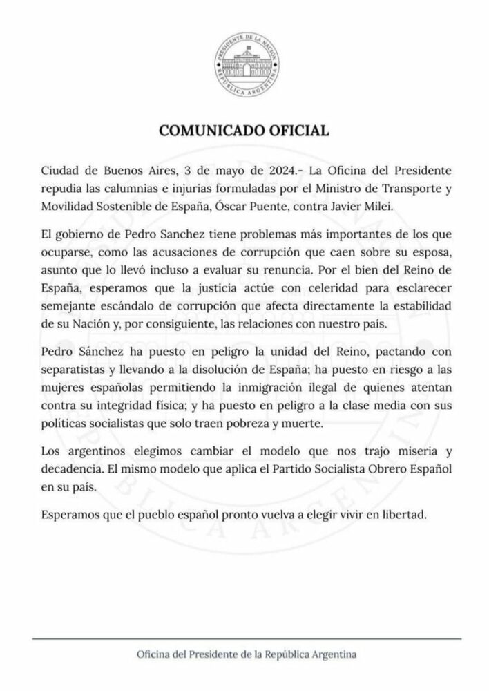 🇦🇷🇪🇦 | ÚLTIMA HORA: Contundente comunicado del gobierno de Javier Milei contra Pedro Sánchez y su ministro de Transporte.