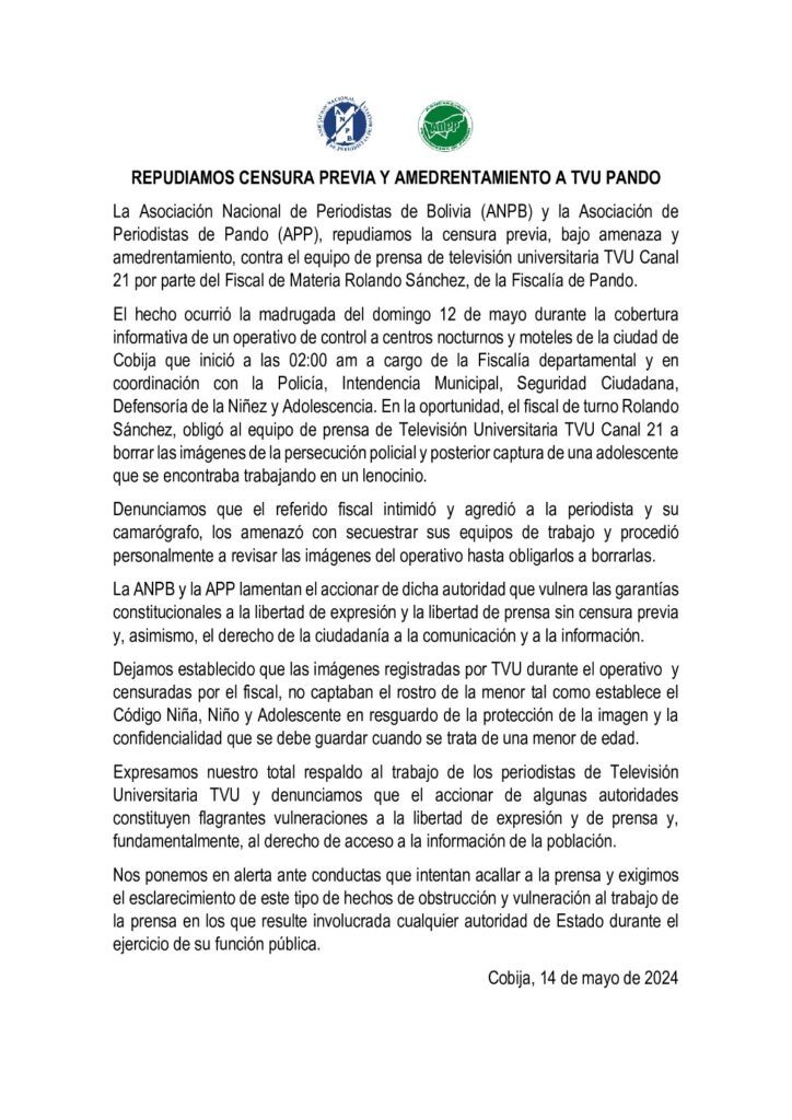La Asociación Nacional de Periodistas de Bolivia (ANPB) y la Asociación de Periodistas de Pando (APP), repudiamos la censura previa, bajo amenaza y amedrentamiento, contra el equipo de prensa de televisión universitaria TVU Canal 21 por parte del Fiscal de Materia Rolando Sánchez, de la Fiscalía de Pando.