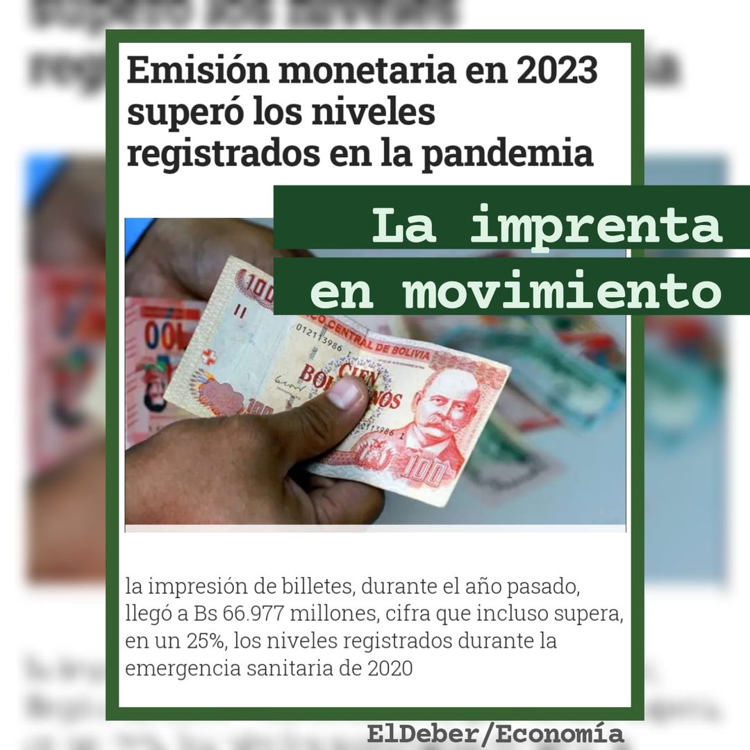 ▪️La emisión monetaria se incrementa en el país. Datos del Banco Central de Bolivia (BCB) demuestran que la impresión de billetes, durante el 2023, llegó a Bs 66.977 millones, cifra que incluso supera, en un 25%, los niveles registrados durante la emergencia sanitaria de 2020.