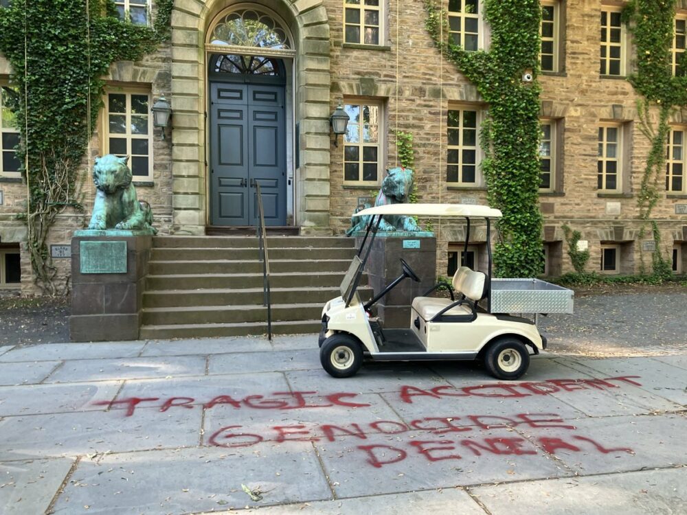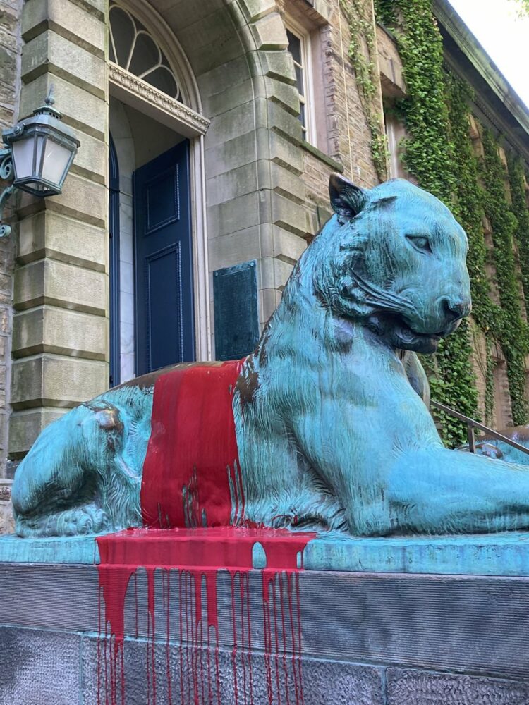 Estudiantes pro-Palestina de la Universidad de Princeton vandalizaron una estatua en el campus con pintura roja y grafitearon el suelo con el mensaje “Tragic Accident Genocide Denial”. https://t.co/odAWY8iSic