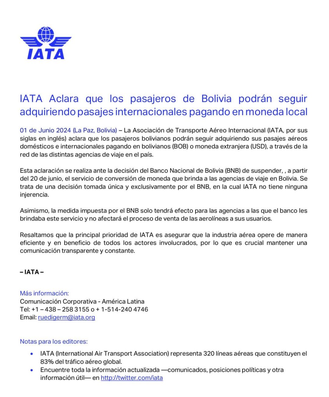 IATA se retracta: “Pasajeros en Bolivia podrán seguir adquiriendo pasajes internacionales en moneda local”
