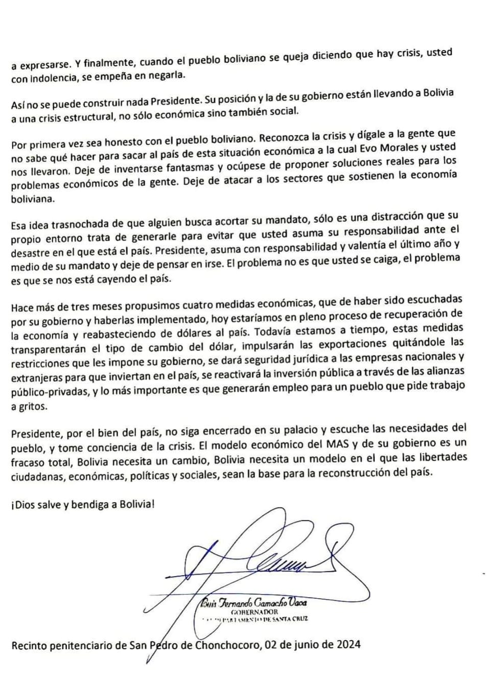 En una carta pública dirigida al presidente Luis Arce Catacora, el Gobernador de Santa Cruz, Luis Fernando Camacho, expone una serie de críticas sobre la gestión del gobierno. En su «Carta Pública», Camacho señala diversos aspectos que considera han llevado al país a una crisis tanto económica como social.