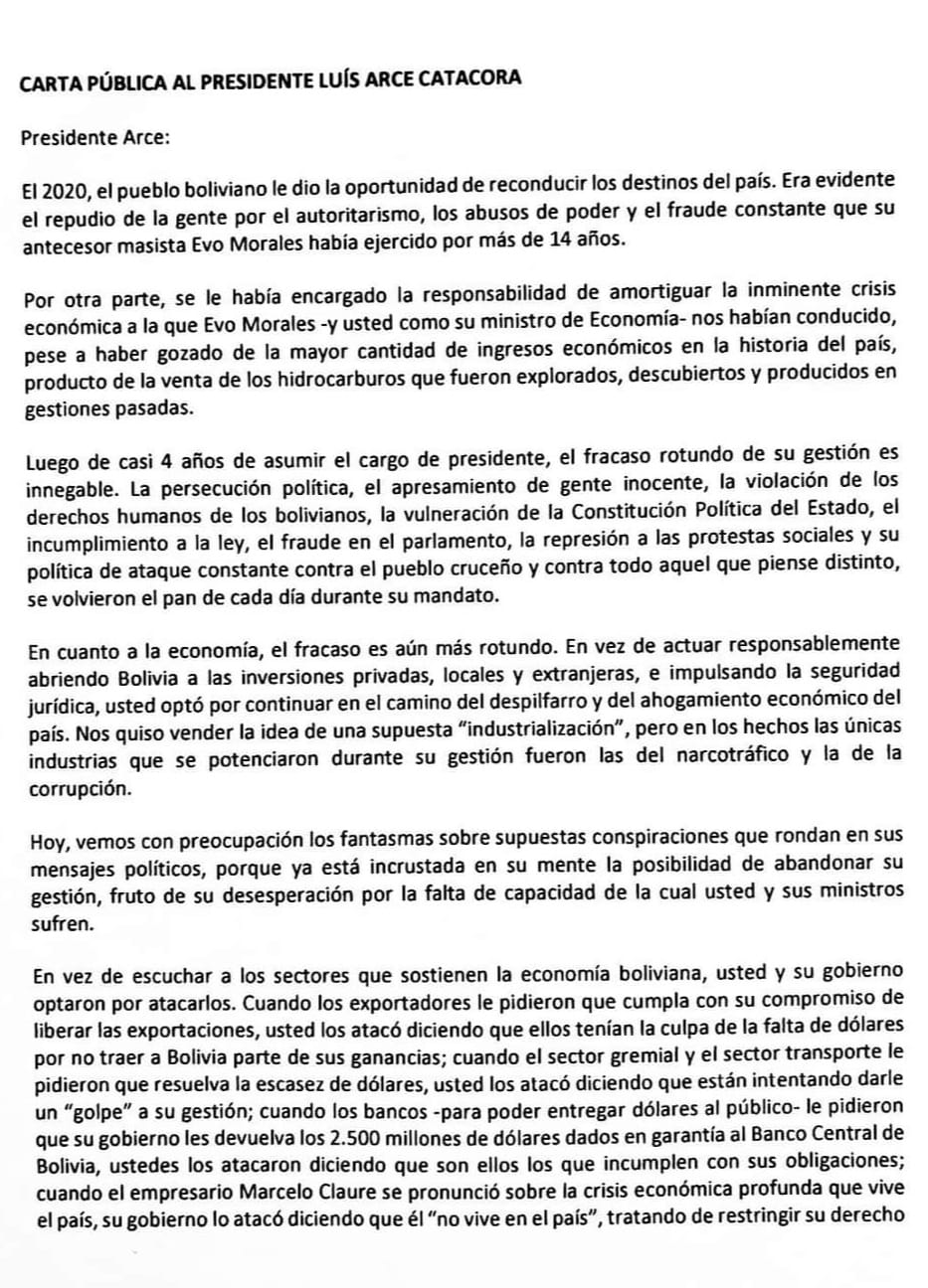 Camacho, difunde «Carta Pública al Presidente Luis Arce Catacora” denunciando el fracaso de modelo económico y gestión.