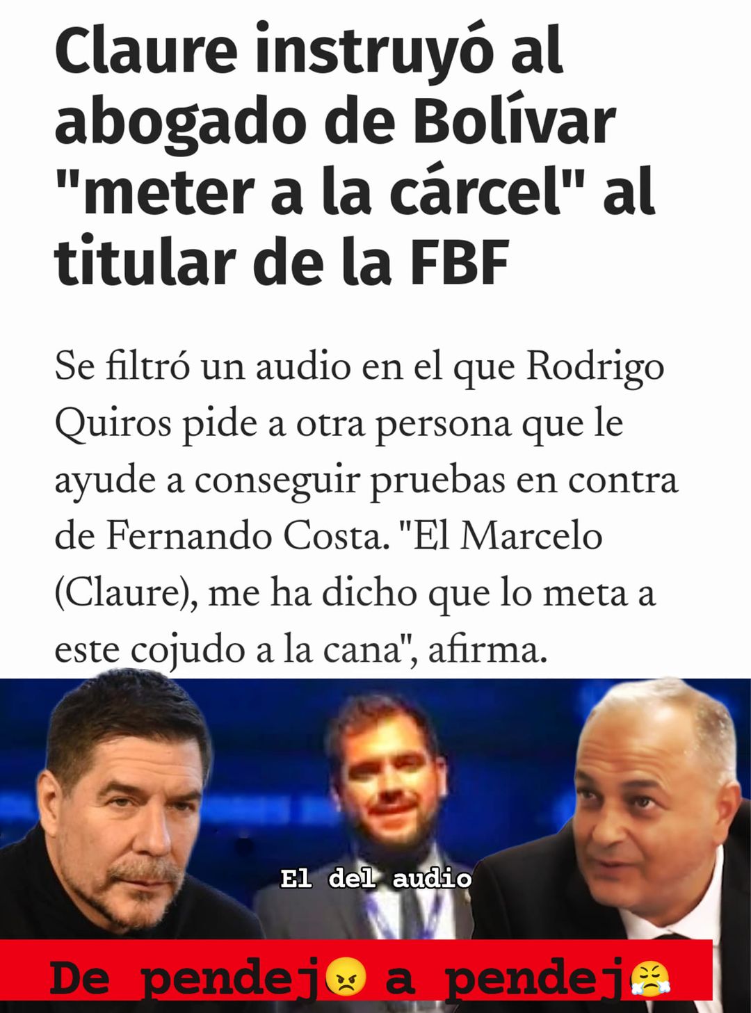 Según ✍️relata el periodista Marco Mejia, «El secretario general del club Bolívar, Rodrigo Quiros, afirma en un audio que se filtró en esta jornada que recibió una instrucción del presidente de la Academia, Marcelo Claure para “meter a la cárcel”, al titular de la Federación Boliviana de Fútbol (FBF), Fernando Costa»