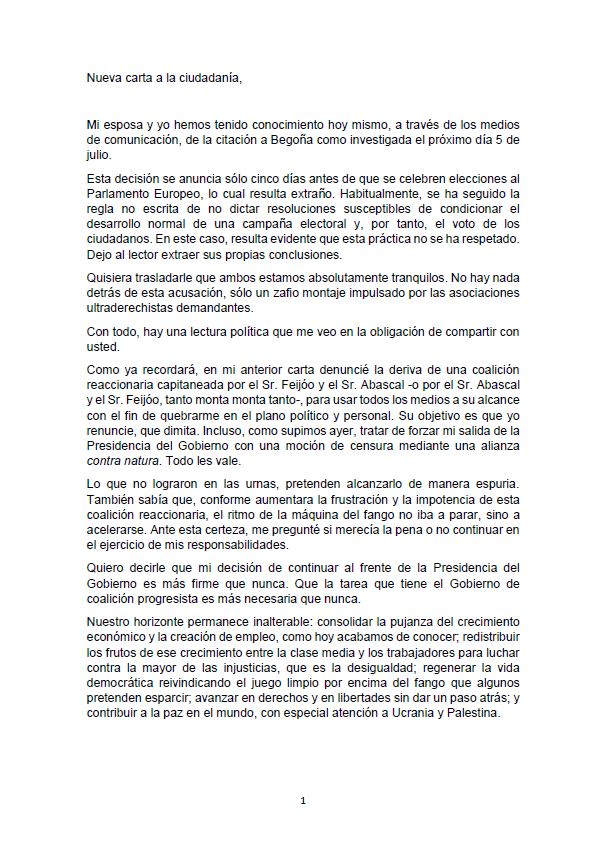 En una muestra de desesperación, Pedro Sánchez ha emitido una carta pública defendiendo a su esposa, Begoña Gómez, tras ser citada a declarar el próximo 5 de julio en calidad de investigada.