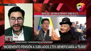 El Viceministro de pensiones, Franz Apaza, informo que desde el mes de julio las personas jubiladas en el sistema de reparto podrán cobrar el retroactivo del incremento de 2,72% que se estableció.