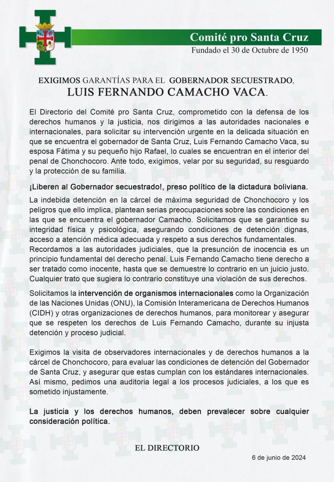 Desde el Comité Cívico Pro Santa Cruz emiten un comunicado donde manifiestan preocupación por los situación del Gobernador Camacho , su esposa y su pequeño hijo, que están en el penal de Chonchocoro y, exigen, velar por la seguridad, el resguardo y la protección de él y su familia.