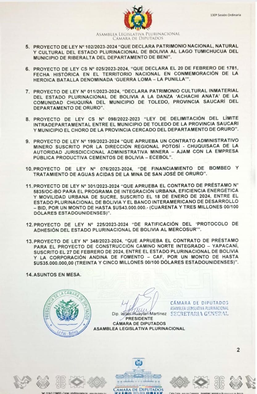 Cámara de diputados convoca a sesión este jueves para debatir crédito de Yapacani, es el ultimo punto del orden del día