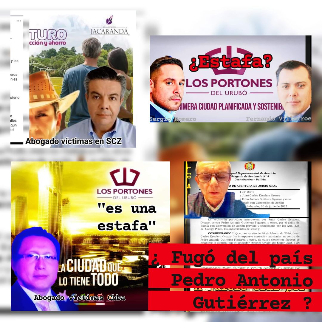 Con gente de Santa Cruz, Cochabamba y La Paz que le compró a Pedro Antonio Gutiérrez Figueroa en las urbanizaciones que ofrecía vía Los Portones del Urubó 🚪y en las que nunca vieron obras o peor aún los documentos de esos terrenos es que hoy sus asesores legales declaran que «se consumó la estafa inmobiliaria jamás vista en Bolivia»