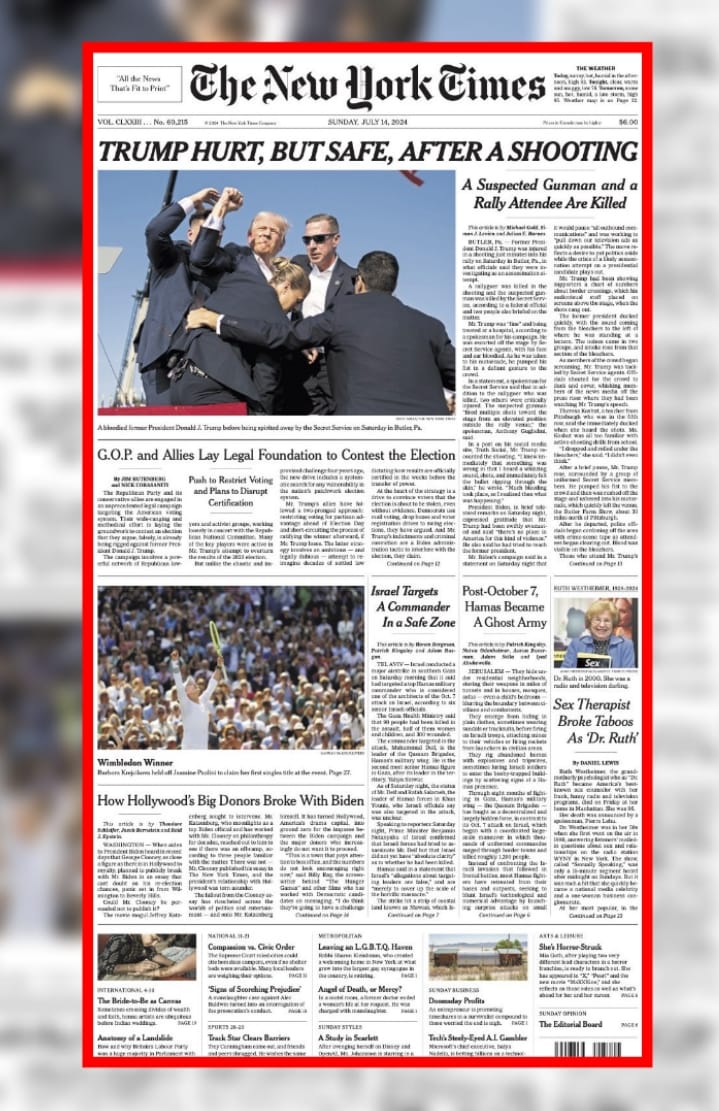 🗞️La gran mayoría de los medios eligió ilustrar la noticia con la foto -ya histórica- del candidato republicano ensangrentado y con el puño levantado mientras era retirado del escenario tras ser herido en una horeja durante un mitín en Pennsylvania