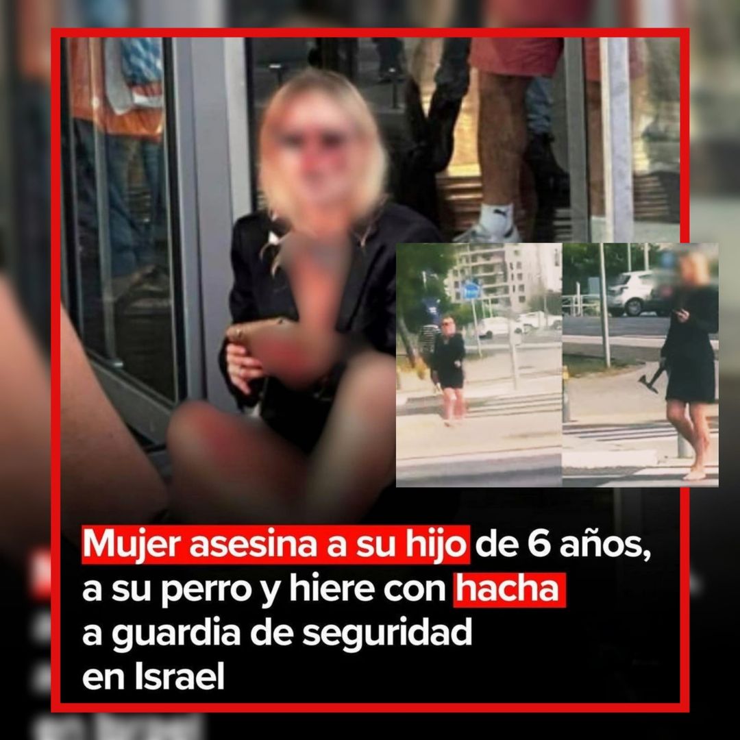 La mujer fue vista armada con un hacha mientras caminaba por la calle rumbo al centro comercial Seven Stars Mall, al norte de Tel Aviv. Tenía puesto un vestido negro, en una mano llevaba una bolsa del mismo color mientras en la otra portaba el arma blanca. Iba descalza, con las piernas y el rostro cubiertos de sangre 🩸.