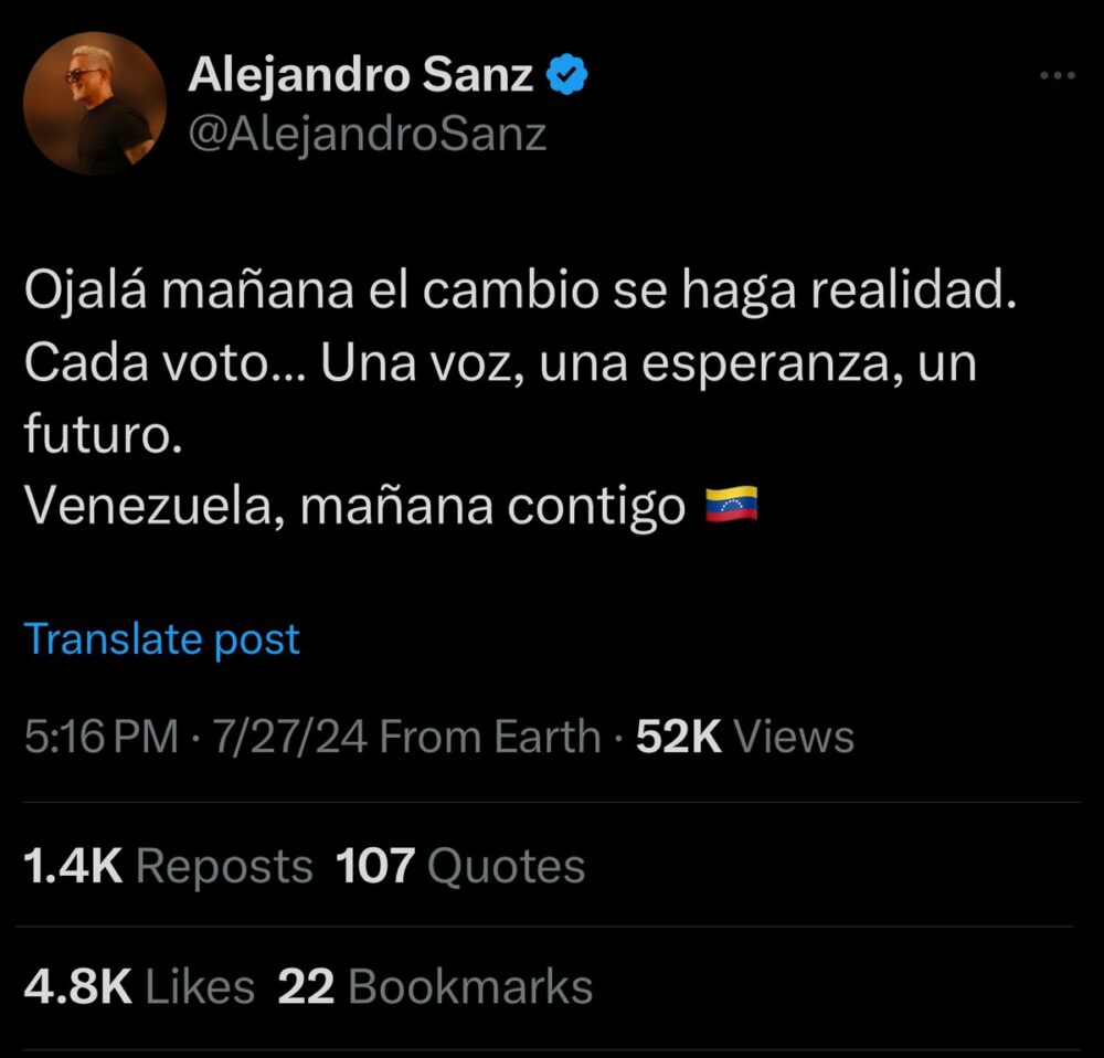 El famoso cantante y compositor español Alejandro Sanz, ha expresado su apoyo a Venezuela en un inspirador mensaje: “Ojalá mañana el cambio se haga realidad. Cada voto… Una voz, una esperanza, un futuro. Venezuela, mañana contigo 🇻🇪”. https://t.co/c4L5gtjySw