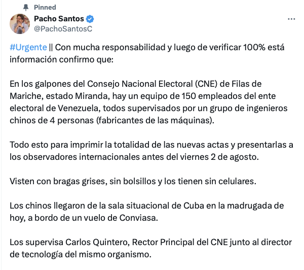 «Esta denuncia del exvicepresidente @PachoSantosC explica la razón que tiene el narcodictador para proclamarse ganador de unas elecciones sin pruebas, para esconderse y ordenar la captura de Edmundo González y María… https://t.co/EMZMPZT8L6 https://t.co/Tb1JeReTwe