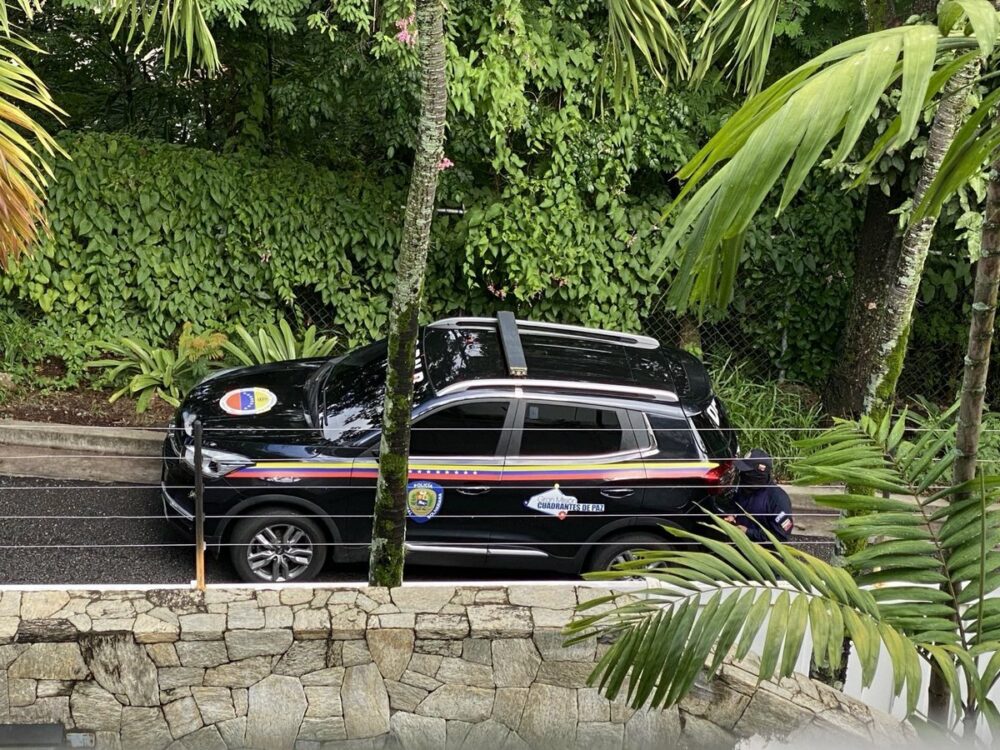 Funcionarios armados con los rostros tapados de la dictadura venezolana se encuentran en este momento en las puertas de la Embajada de Argentina.