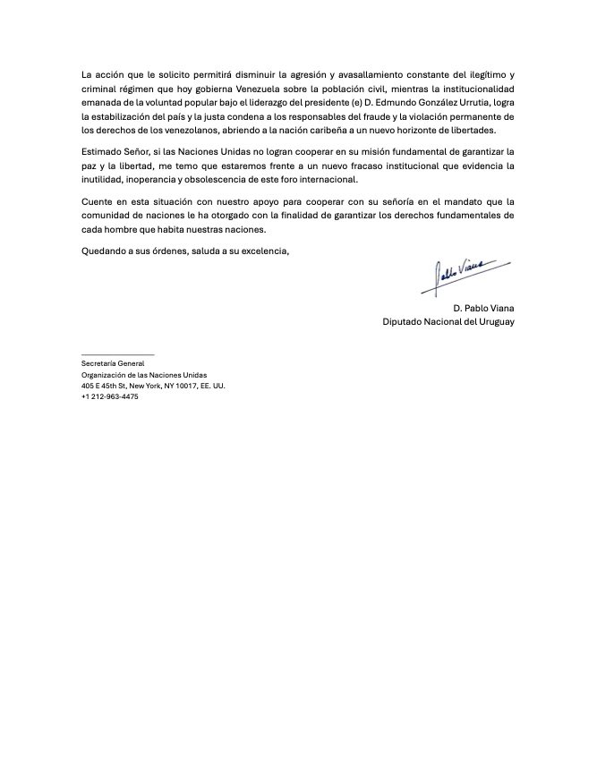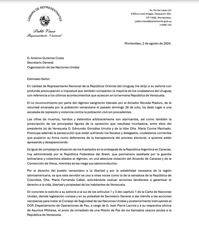 El diputado uruguayo Pablo Viana (@pabloviana_ok) acaba de solicitar a la ONU y al Secretario General António Guterres que envíen una Misión de Paz a Venezuela para proteger a la población civil y apoyar al presidente (e) Edmundo González y la líder María… https://t.co/CHvu6PF0PC https://t.co/nstKjfhz7M