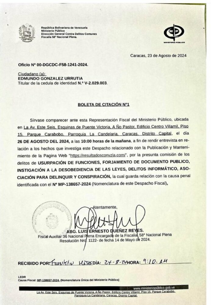 Según la citación, el presidente electo deberá comparecer en la sede del MP, en Caracas, como parte de una investigación por la “presunta… https://t.co/p7ySE7Dr16 https://t.co/jESWnwUucJ