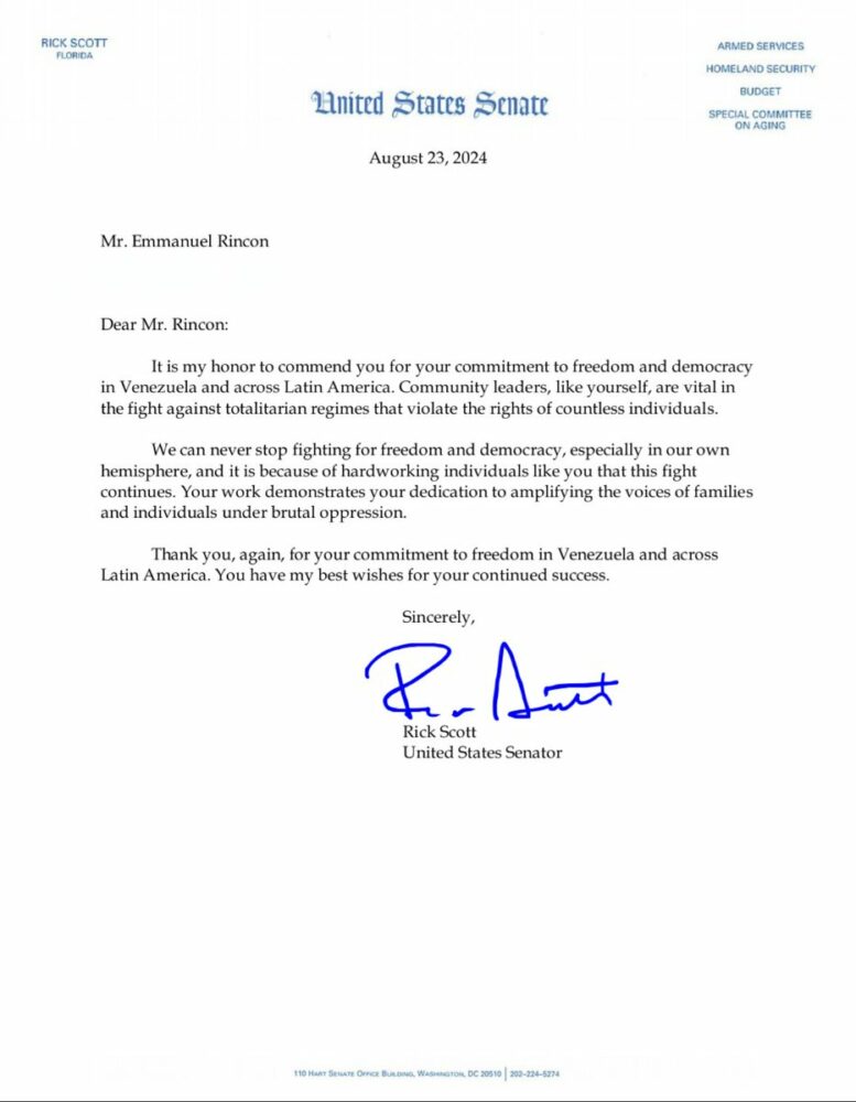 El senador de los Estados Unidos, Rick Scott, ha enviado una carta de reconocimiento a Emmanuel Rincón (@EmmaRincon), destacando su dedicación a la libertad y la democracia en Venezuela y América Latina.