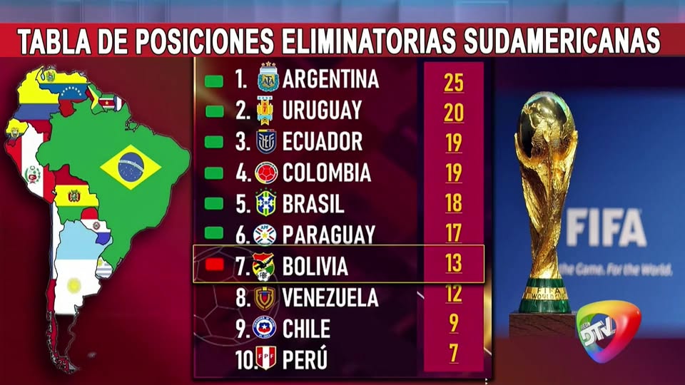 Bolivia sigue con vida en la lucha por el Mundial, ubicada en la séptima posición con 13 puntos, a solo 3 unidades de Paraguay (6º, 17 puntos). La clasificación sigue siendo un sueño alcanzable para la selección boliviana en esta recta final de las Eliminatorias Sudamericanas. Así está la tabla de posiciones tras 12 fechas: Argentina lidera con 25 puntos, seguida de Uruguay (20), Ecuador (19), y Colombia (19). Brasil (18) y Paraguay (17) completan los lugares de arriba, mientras que Bolivia, con 13 puntos, sigue luchando por escalar posiciones y mantener viva la esperanza mundialista.