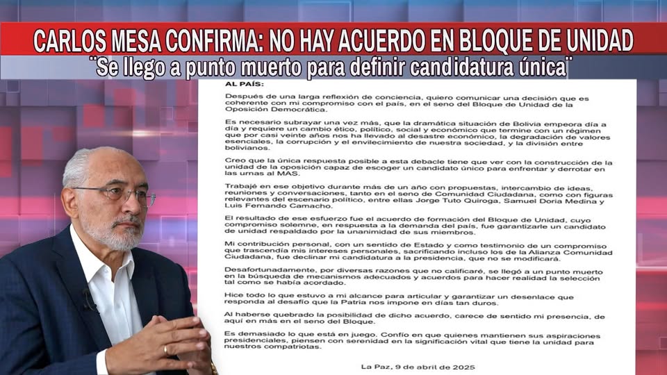 Carlos Mesa anunció su retiro definitivo del Bloque de Unidad de la Oposición Democrática, reafirmando su renuncia previa a la candidatura presidencial. En su carta, Mesa señaló que la grave crisis económica, la corrupción y la división en Bolivia exigen un cambio profundo, que solo podrá lograrse con una oposición unida, capaz de presentar un candidato único frente al MAS. Tras más de un año de esfuerzos para alcanzar un consenso con figuras clave de la oposición, Mesa lamentó que el Bloque no avanzara en la selección de un candidato y consideró que su presencia ya no tenía sentido. Finalmente, hizo un llamado a los demás aspirantes presidenciales para que reflexionen sobre la importancia de la unidad en estos tiempos difíciles.