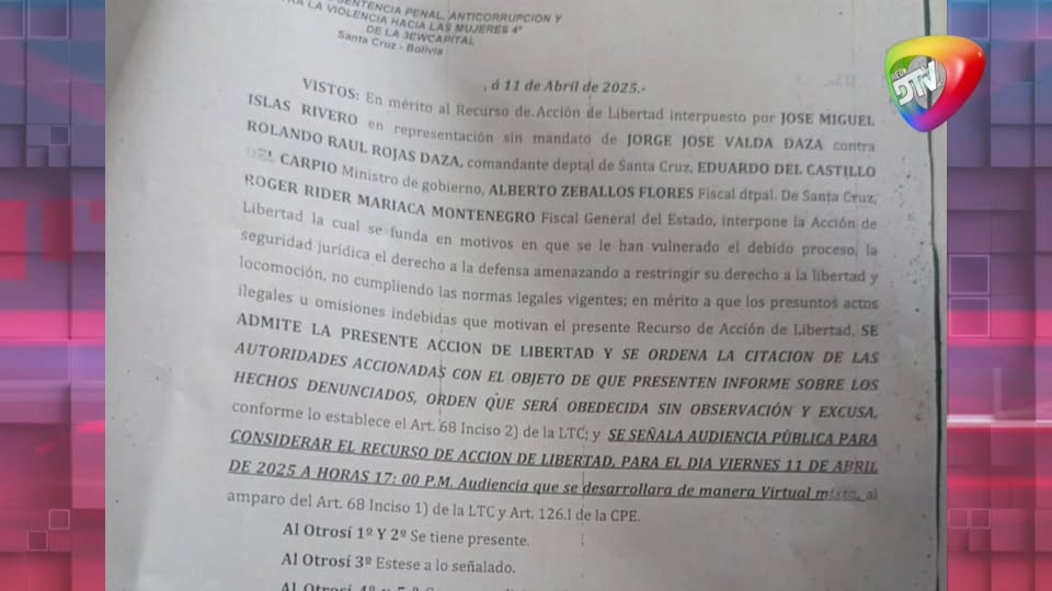 El Tribunal de Sentencia Penal, Anticorrupción y Contra la Violencia hacia las Mujeres N° 4 de Santa Cruz admitió este viernes una Acción de Libertad interpuesta a favor del abogado Jorge Valda. La medida fue solicitada por José Miguel Islas Rivero, quien denunció vulneraciones al debido proceso y a los derechos fundamentales del jurista, actualmente detenido por su supuesta implicación en el fallido alzamiento militar del 26 de junio de 2024.