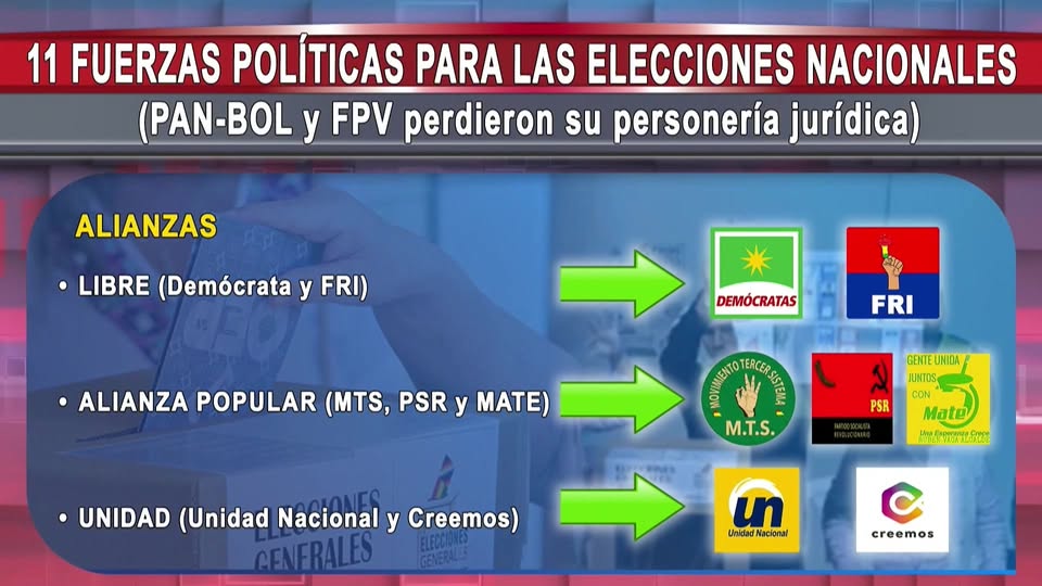 El Tribunal Supremo Electoral confirmó que once organizaciones políticas participarán en las elecciones generales de 2025, luego de que el Partido de Acción Nacional Boliviano (Pan-Bol) y el Frente para la Victoria (FPV) perdieran su personería jurídica por decisión de la sala plena. En carrera quedan seis partidos —entre ellos el MAS, el MNR y APB-Súmate— y cinco alianzas, como LIBRE (Demócrata y FRI), UNIDAD (Unidad Nacional y Creemos) y Alianza Popular (MTS, PSR y MATE), conformando el nuevo mapa electoral rumbo a los comicios de agosto.