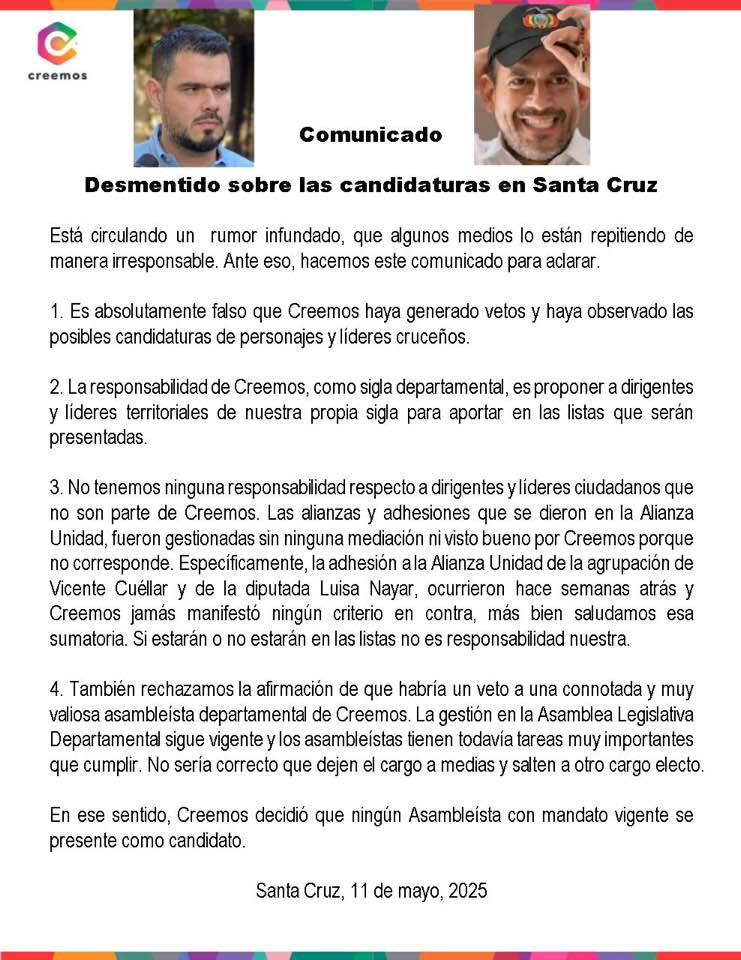 Rumor infundado: Creemos desmiente listas negras. “Falso, no generamos vetos”. Ni vetos a Vicente Cuéllar ni a Luisa Nayar ni a Paola Aguirre, explican.