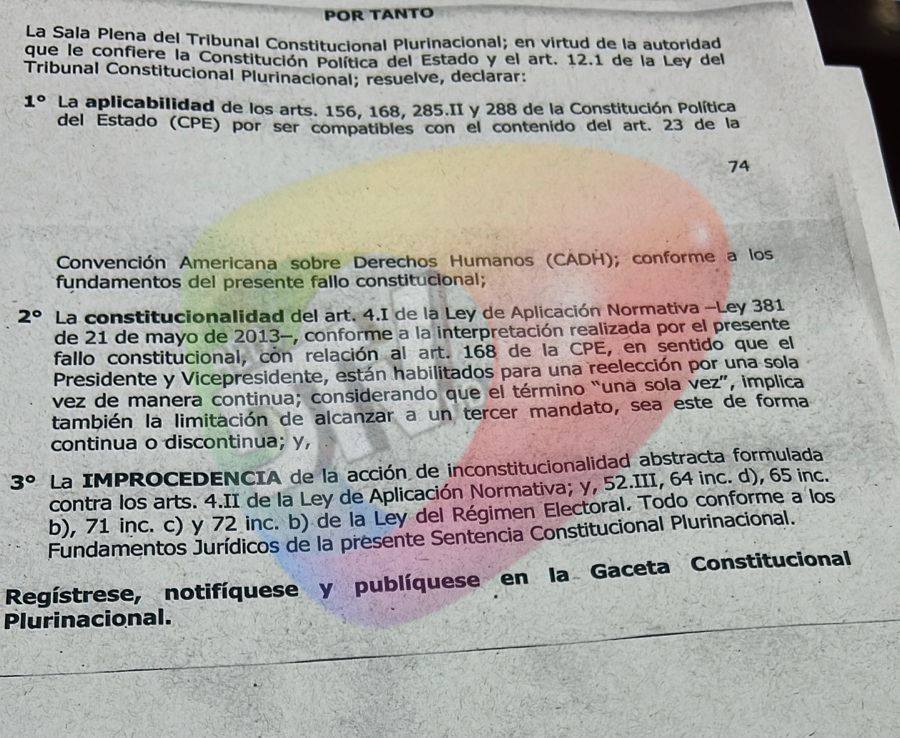 Según la resolución, la Sala Plena del TCP declaró la aplicabilidad de los artículos 156, 168, 285.II y 288 de la Constitución Política del Estado (CPE), al considerarlos compatibles con el artículo 23 de la Convención Americana sobre Derechos Humanos. Asimismo, ratificó la constitucionalidad del artículo 4.I de la Ley de Aplicación Normativa (Ley 381 de 21 de mayo de 2013), estableciendo que el Presidente y Vicepresidente están habilitados para una sola reelección continua. Según el fallo, la expresión “una sola vez” también implica la prohibición de un tercer mandato, sea este continuo o discontinuo.