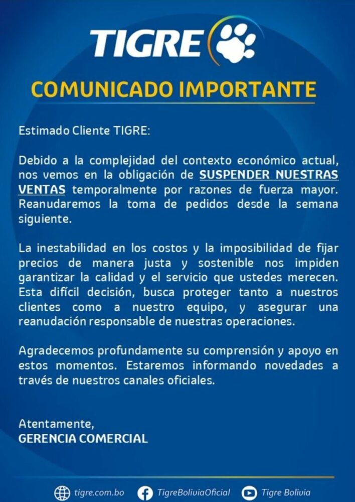 Empresa Tigre suspende labores de manera temporal en Bolivia por el contexto actual :…