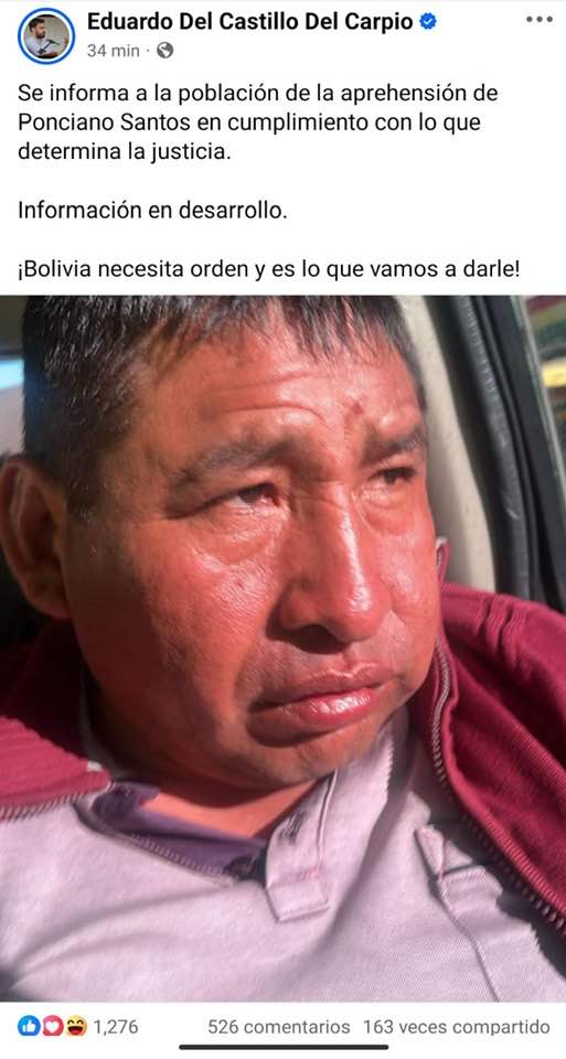 “Vamos a poner orden”, dice el ministro del Castillo. Y muestra la foto del dirigente evista Ponciano Santos, detenido.