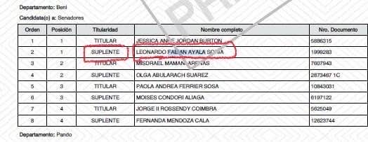 Leonardo Ayala, exjefe de bancada de Creemos y cercano a Luis Fernando Camacho, dio un salto ideológico inesperado al postular como senador suplente del Movimiento Tercer Sistema (MTS), en la lista encabezada por Jéssica Jordan. Su candidatura, junto con toda la lista del MTS, está en suspenso, mientras la sigla enfrenta una posible inhabilitación.