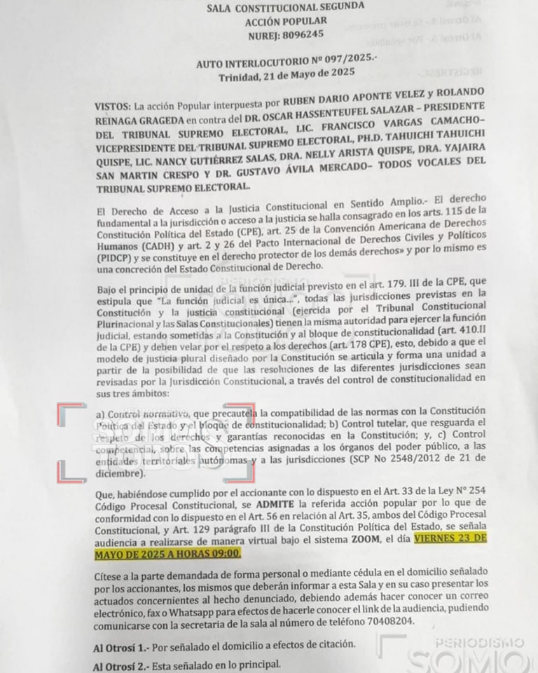 El Movimiento de Izquierda Revolucionaria (MIR) activó una acción popular en el Beni para recuperar su personería jurídica rumbo a las elecciones generales de 2025. La demanda fue admitida por la Sala Constitucional Segunda y la audiencia virtual se realizará este viernes 23 de mayo. Los vocales del TSE, incluido su presidente, fueron citados oficialmente. El MIR alega vulneración de derechos políticos fundamentales.