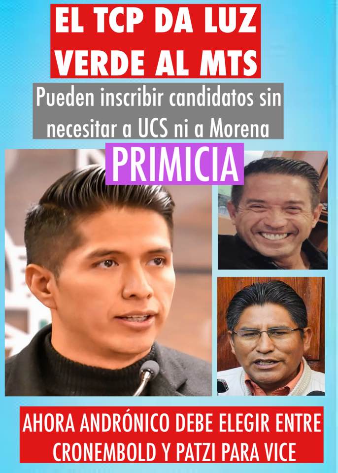 Primicia: el TCP da luz verde al MTS. Ya puede inscribir a Andrónico como candidato a Presidente. Andrónico ahora debe elegir su candidato a vicepresidente entre Mario Cronembold y Félix Patzi. Se los conté más temprano. Y les dije “anótenlo”.