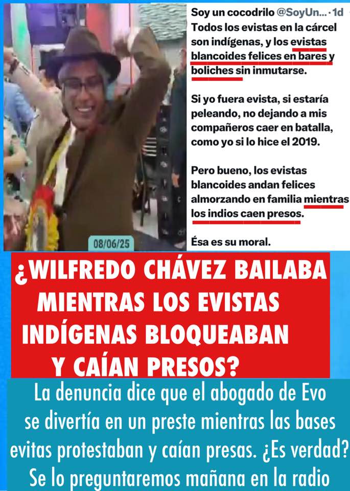 El acusado es Wilfredo Chávez, abogado de Evo. Lo acusan en redes de estar de fiesta mientras sus compañeros más humildes luchaban y eran detenidos.