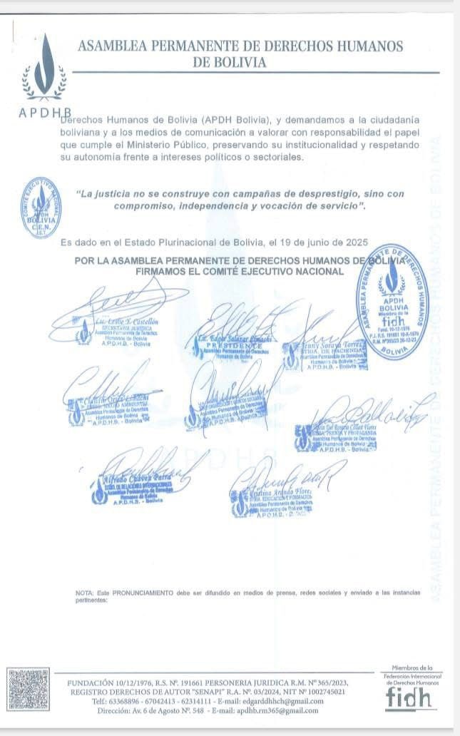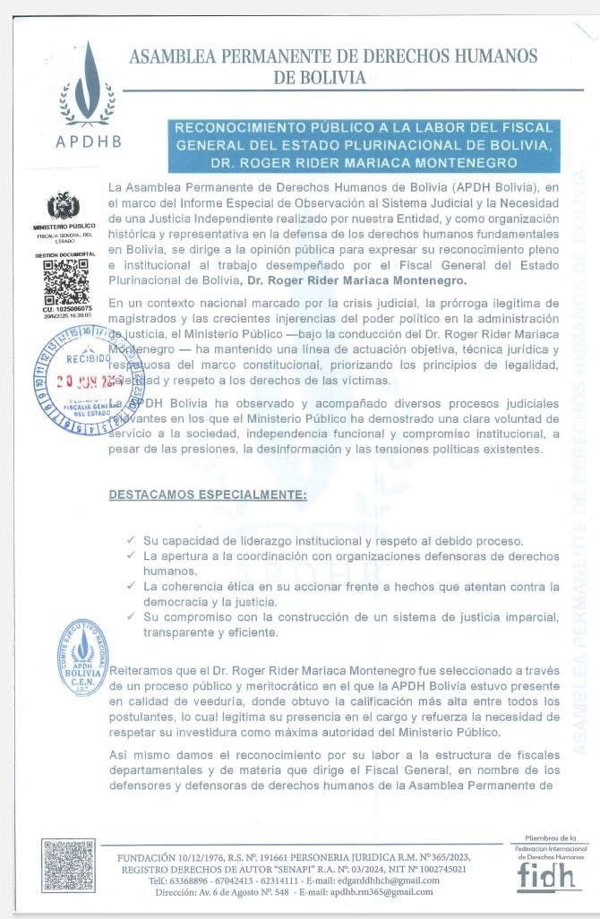 π΄ La Asamblea Permanente de Derechos Humanos de Bolivia (APDH Bolivia) Reconoce, valora y respalda la labor del Fiscal General del Estado, Dr. Roger MarΓaca Montenegro, conforme a los resultados del Informe Especial de Observacion al Sistema Judicial y la Necesidad de una Justicia Independiente, elaborado por nuestra instituciΓ³n.