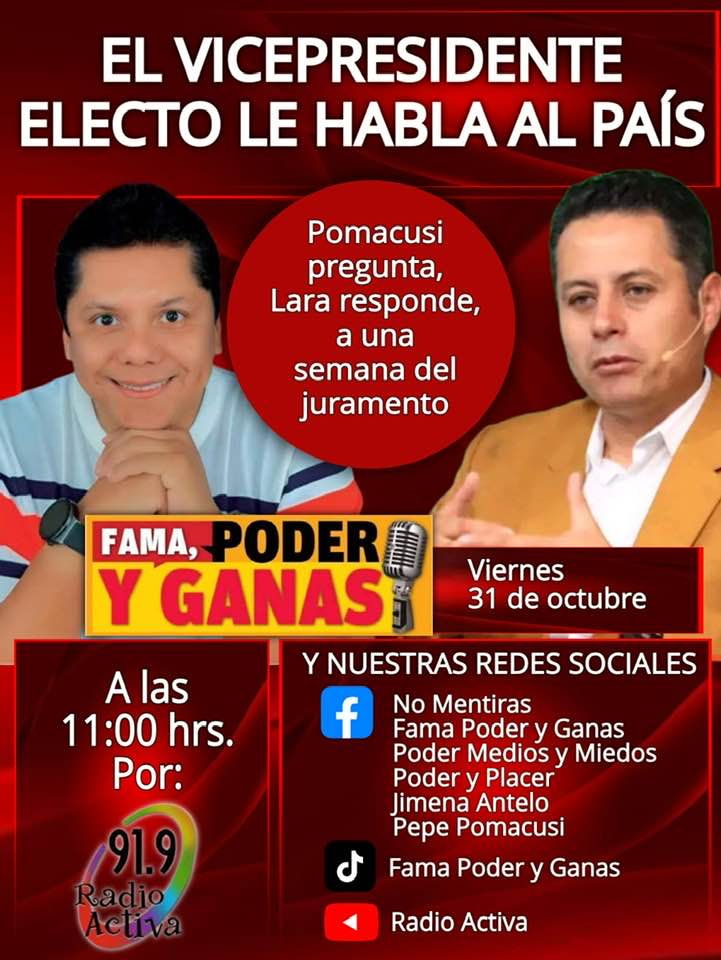 Hoy, Lara en vivo. Habla el vicepresidente, a las 11.00 amCategorías NoticiasEtiquetas , Facebook, Pepe Pomacusi Periodista 31/10/2025 Fuente: Pepe Pomacusi Periodista
