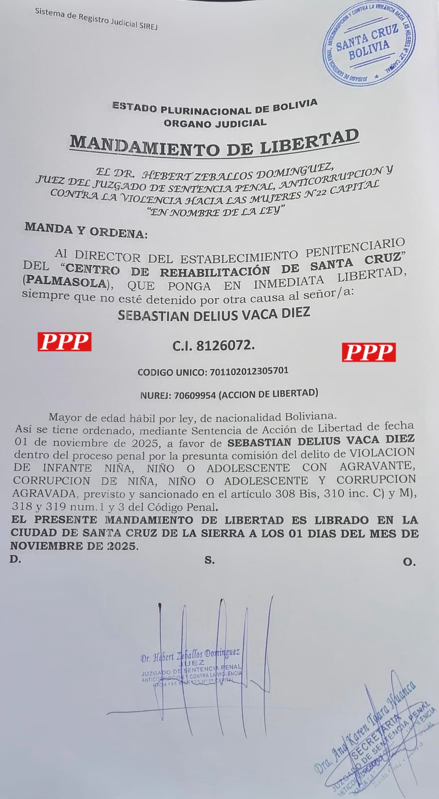 Sebastián Delius se escapó de Bolivia para no enfrentar la justicia. Fue atrapado en España. Y luego extraditado a Bolivia. Y en Bolivia la justicia lo acaba de dejar libre. Lo enviaron a la cárcel en abril. Lo liberaron en el primer día de noviembre. Seis meses y ya!