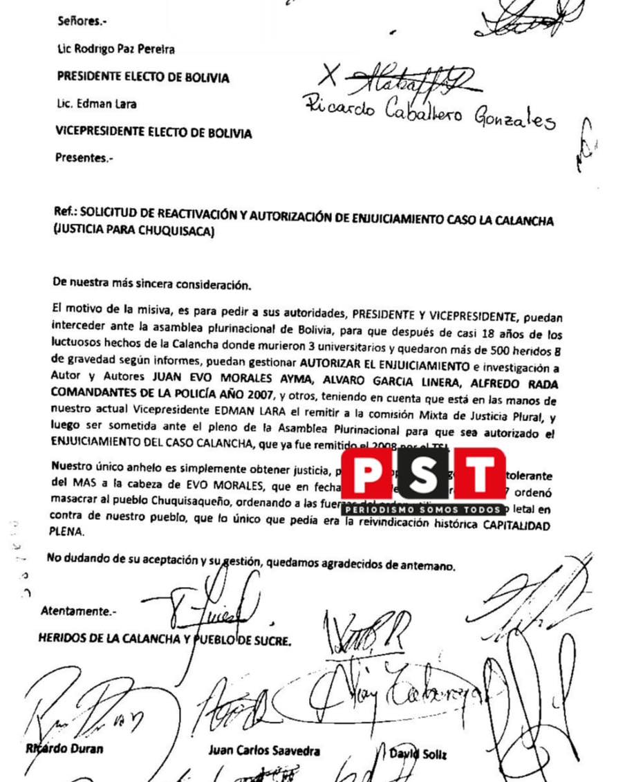 A 18 años de los hechos luctuosos de La Calancha, familiares de las víctimas esperan afuera de la Casa de la Libertad al presidente Rodrigo Paz y al vicepresidente Edman Lara, para entregarles una carta firmada por todos, exigiendo que se reabra la investigación y se juzgue a Evo Morales y sus exministros, a quienes consideran responsables de la masacre.