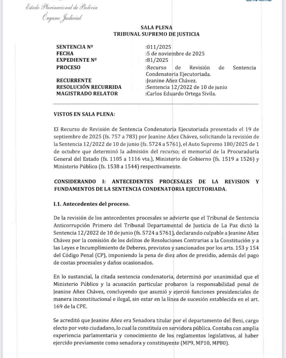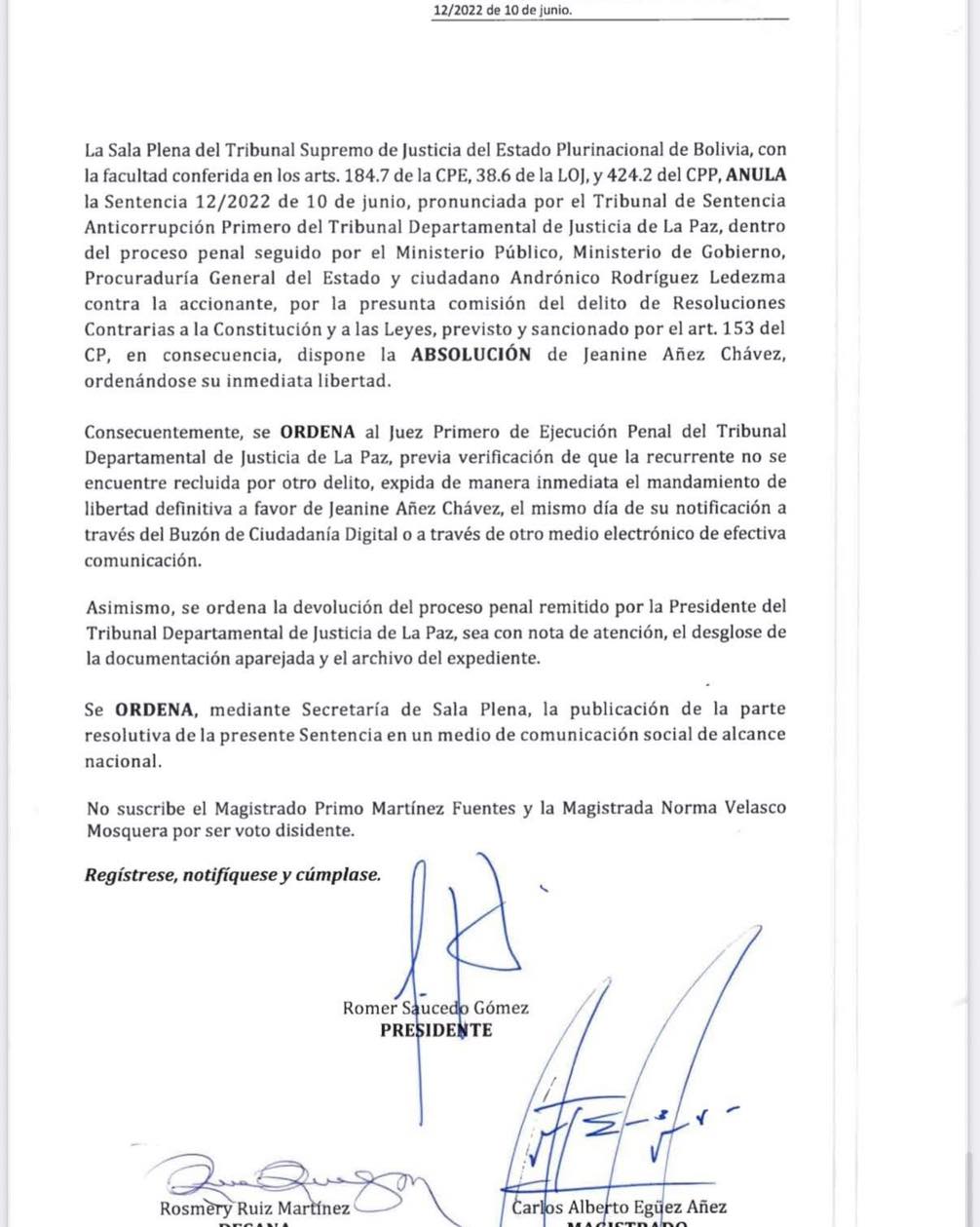Hemos cumplido con la formalidad de las notificaciones, el recurso extraordinario de revisión de sentencia de la ex presidente Jeanine Añez Chávez, ya es de conocimiento de los sujetos procesales. La Sala Plena del Tribunal Supremo de Justicia, ha dispuesto su libertad inmediata.