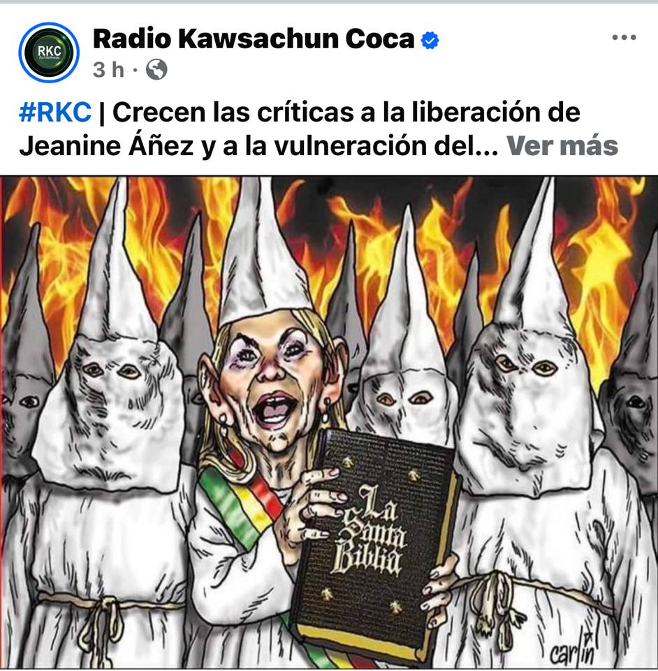 Evo agrede a Jeanine Áñez. No la respeta, la desprestigia y en su radio la muestra como miembro del Ku Kux Klan.