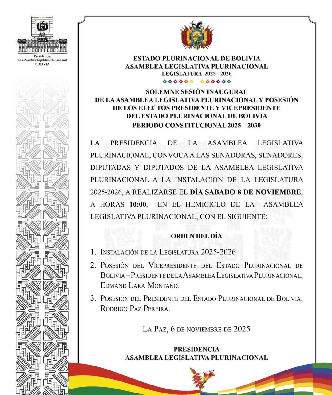 La Asamblea Legislativa Plurinacional (ALP) convocó oficialmente a la instalación de la legislatura 2025-2026, que se realizará el sábado 8 de noviembre a las 10:00 en el hemiciclo de la Asamblea.