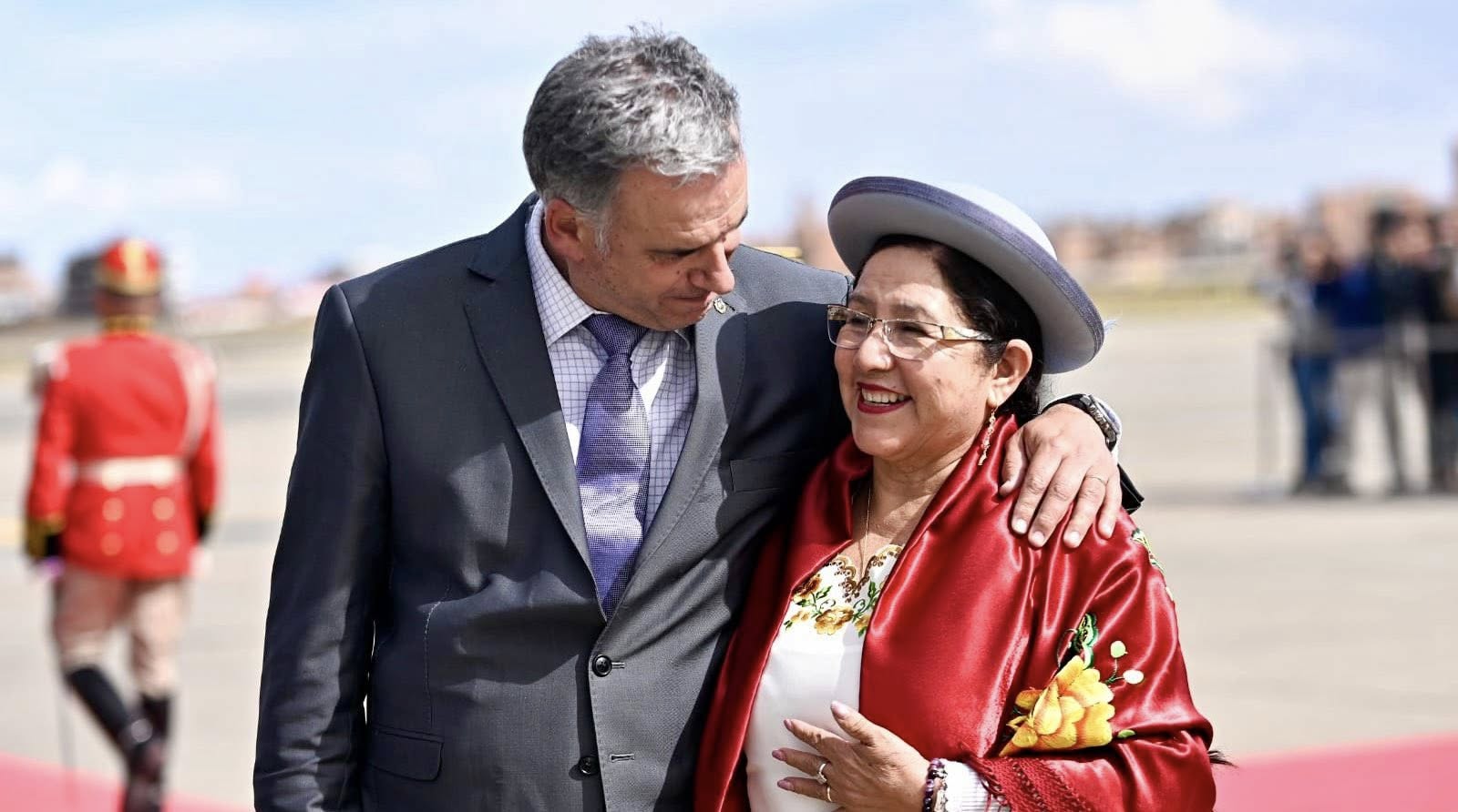 Un abrazo de corbata con pollera. Es el presidente de Uruguay, con la canciller de Bolivia